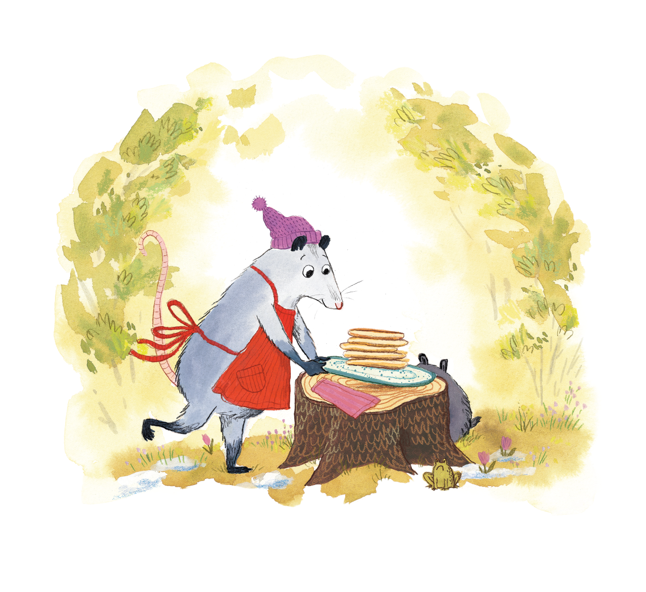 Опосумът Топси приготвя почерпка под надслов „Добре дошла, пролет!“ за своята приятелка мечката Луана, която е спала през цялата зима. Тя е донесла мляко, яйца, горски плодове и сироп и скоро в тигана се появяват пет перфектни палачинки, прясно изпечени. Но щом Топси се обръща с гръб — МЛЯС! МЛЯС! МЛЯС! Тя открива, че някой е изял всички палачинки! Няма проблем, просто ще направи още. Пет, десет, петнайсет… Но ето че се случва отново! Кой ли е крадецът?!